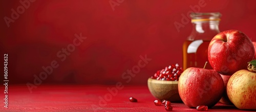Rosh hashanah traditional symbols. Apples, pomegranate and honey on a red background. Copy space.