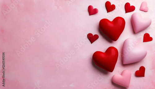 Rote und rosa 3D-Herzen liegen auf einem Aquarell-Hintergrund in sanften Rosatönen. Ein romantisches und künstlerisches Design für Liebe und Valentinstag. Generative KI.