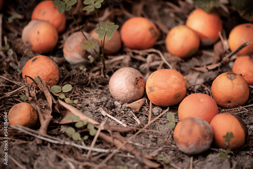 Rotten mandarins on dry grass