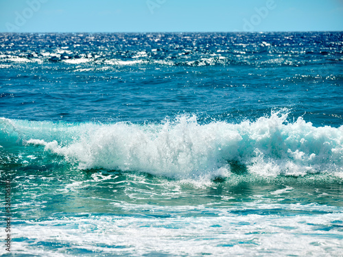 Rough sea with emerald green waves crashing on the beach. In the background the blue sea with sun reflections.