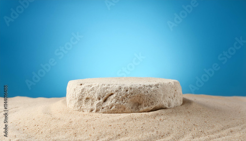Rough stone podium on sand against blue backdrop. Minimalist pedestal. Natural material. Mock-up