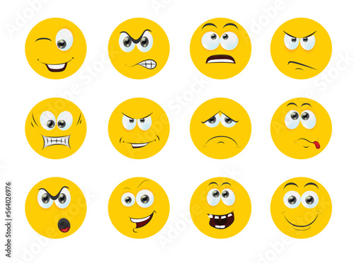 Round abstract comic Faces with various Emotions. Cartoon drawing style. Different colorful characters, Flat design. Hand drawn trendy Vector illustration.