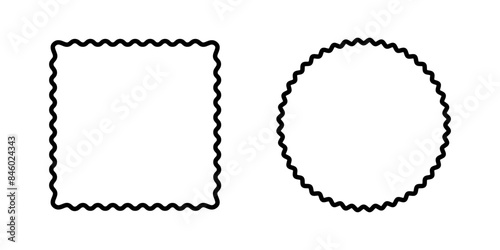 Round and rectangular frames with curvy edges. Circle and square shapes with undulated borders. Empty frilly text boxes, tags or labels isolated on white background. Vector graphic illustration.