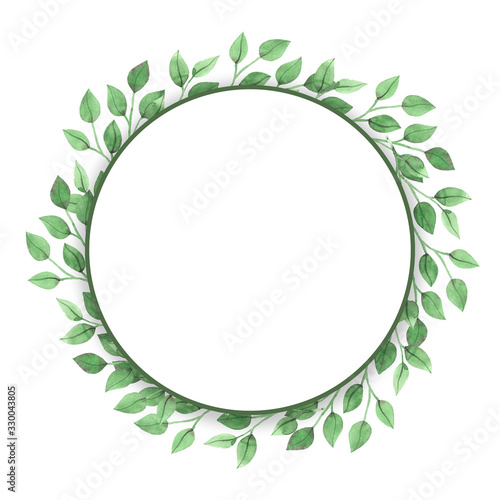 Round background with green leaves, watercolor illustration