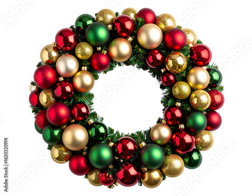 Round Christmas wreath made of shiny red and gold baubles with festive greenery isolated on transparent background PNG