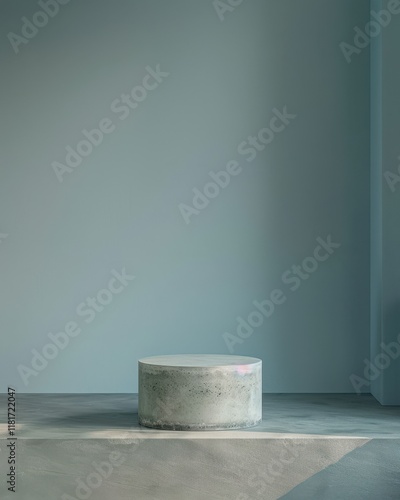 Round concrete pedestal with raw textured finish, placed in a serene blue-toned interior with soft light and shadow, ideal for product display or modern decor