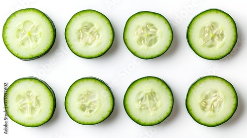 Round cucumber slices from different angles isolated on a white background : Generative AI