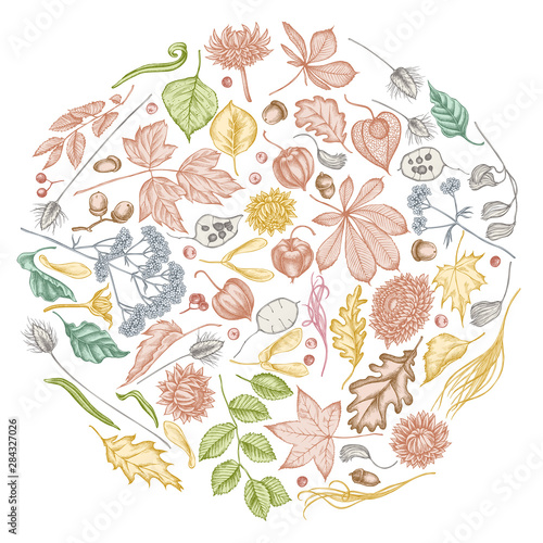 Round design with pastel rowan, rowan, acorn, buckeye, fern, maple, birch, maple leaves, lagurus, feather grass, helichrysum, lunaria, physalis, valerian