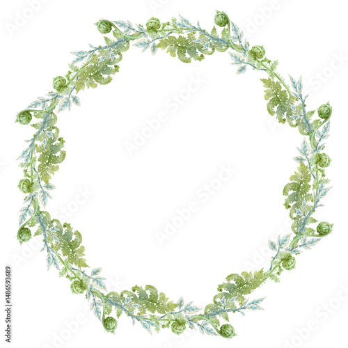 Round fern frame with lush fronds. Hand-drawn watercolor natural frame with opened and curled ferns. Perfect for wedding invitations, botanical prints, minimalist home decor, romantic greeting cards.