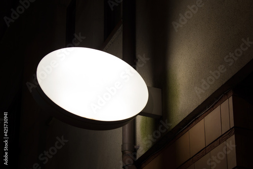 Round glowing light box mockup template at night hanging on the building exterior wall.