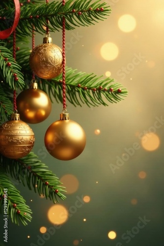 Round golden ornaments hanging from a string, twine or thread, spherical shapes,