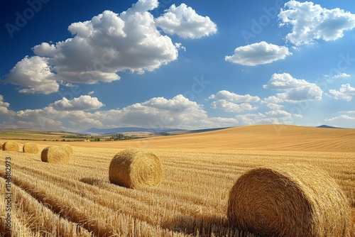 Round hay bales sit in a harvested wheat field under a sky dotted with clouds, illustrating the cycle of agriculture and the beauty of pastoral life in the countryside.