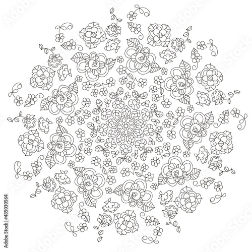 Round monochrome pattern of abstract floral elements for coloring.