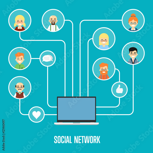 Round people icons connected with laptop. Social network banner on blue background, vector illustration. Smiling cartoon characters. Connecting people, social networking. Teamwork concept.