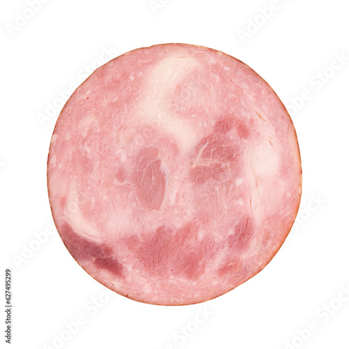 round piece of ham isolated on white background, pork ham cut into slices, with clipping path