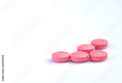 Round pink tablets pill on white background. Vitamins and minerals plus folic acid vitamin E and zinc in drug bottle on gradient background. Pink tablets pills for during and after pregnancy woman.