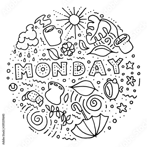 Round sticker in doodle style with names of days of week for notebooks, posters, notebooks and books. Monday