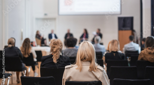 Round table discussion at business convention and Presentation. Audience at the conference hall. Business and entrepreneurship symposium.