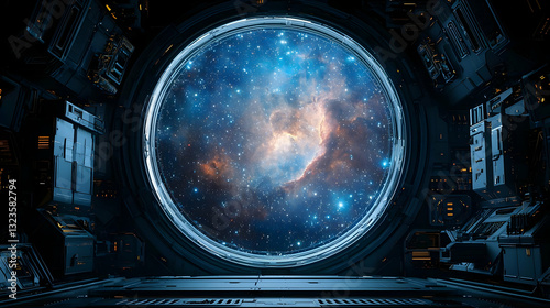 Round Window View of the Galaxy from a Spaceship Interior with Blue Lighting and Starfield