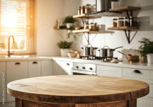 Round wooden kitchen table with natural texture in bright modern home interior with white cabinets, sunlight through window, green plants, shelves and cooking pots in background
