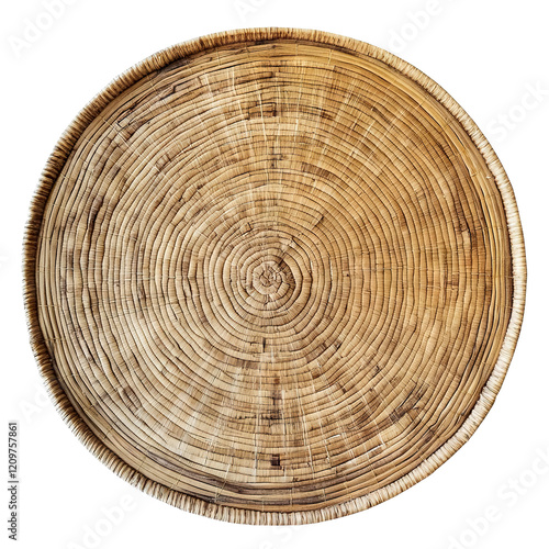 Round woven bamboo mat with natural texture, isolated on transparent cutout background