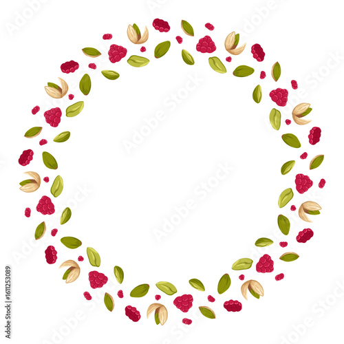 Round wreath with raspberries and pistachios. Vector hand drawn food illustration. Perfect for packaging design, organic branding, dessert labels and healthy snack projects