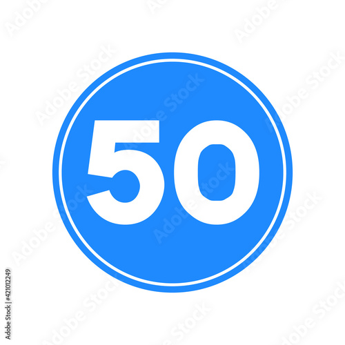 Rounded traffic signal in blue and white, isolated on white background. Minimum speed of fifty