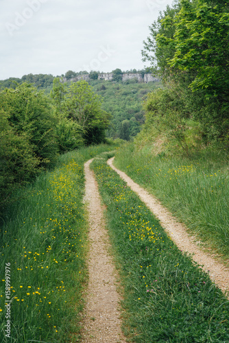Route de campagne. Chemin forestier. Balade champêtre. Route déserte en été. Route mal entretenue. Route bordée de bois et buissons.
