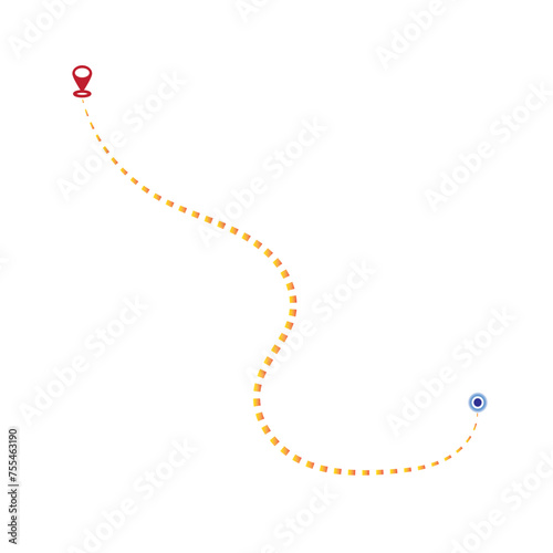 Route location icon, two pin sign and dotted line road, start and end journey symbol, black color vector illustration isolated on white background. GPS navigation line route mark