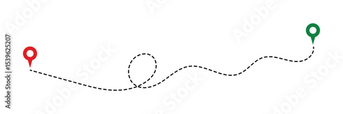 Route location icon, two pin sign and dotted line road, start and end journey symbol, black color vector illustration isolated on white background in eps 10.