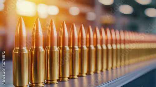 row of brass rifle ammunition with shiny tips, arranged neatly in well lit industrial setting, evokes sense of precision and readiness