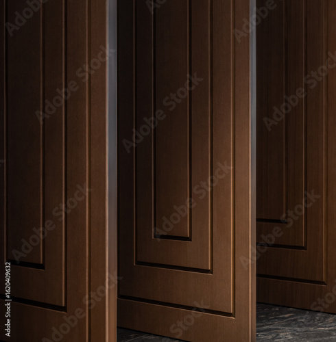 Row of brown wooden doors inside a dark room. Three opened brown doors with rectangular pattern.
