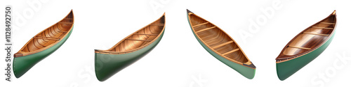 Row of classic wooden canoes peacefully floating on a calm lake or river surrounded by lush green foliage and a serene natural environment Outdoor recreation adventure and concept
