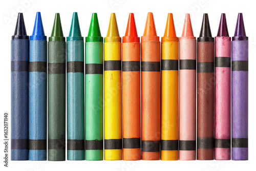 Row of colorful crayons, various hues, arranged in a horizontal line