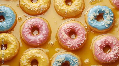 Row of colorful donuts with blue icing. The donuts are arranged in a pattern, with some of them being pink and yellow. Concept of fun and indulgence