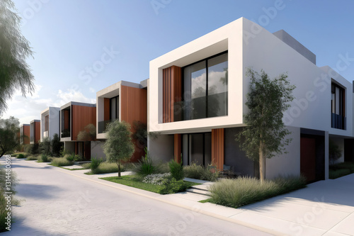 Row of contemporary townhouses showcasing sleek architecture and landscaping, representing modern suburban living