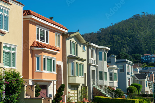 Row of decorative house facades or exteriors in historic districts of san francisco california in late afternoon sun