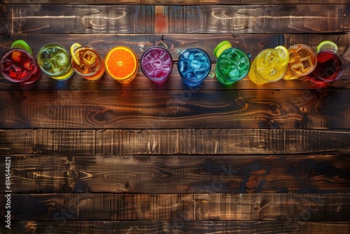 Row of different colored cups on wooden table, perfect for kitchen or dining concepts