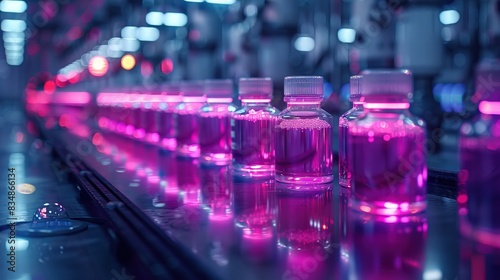 Row of glowing purple liquid in bottles, with a futuristic laboratory background with neon lighting