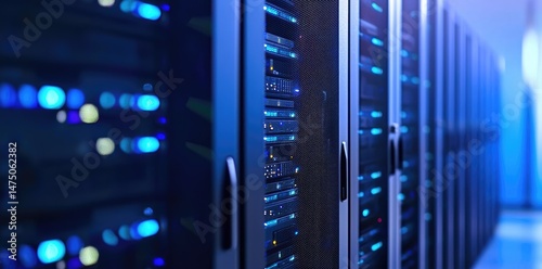 Row of modern server racks with active blue indicators in a data center, ideal for illustrating cloud infrastructure, AI systems, secure networks, and advanced computing.