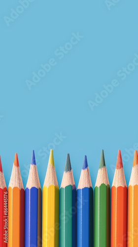 Row of multi-colored pencils on a pink, blue, red and yellow backgrounds