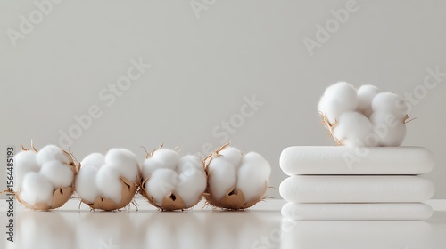 Row of natural cotton flowers and folded soft white towels on white surface