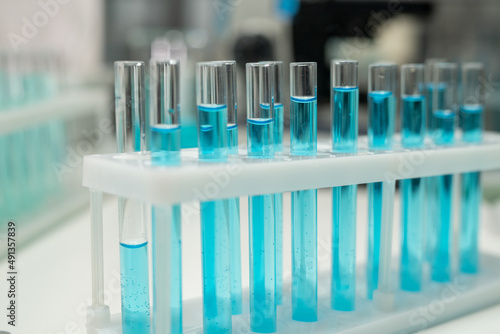 Row of several flasks or test tubes with blue liquid on workplace of modern healthcare worker or scientist in laboratory