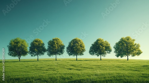 Row of trees, green field, sunrise, idyllic landscape, nature