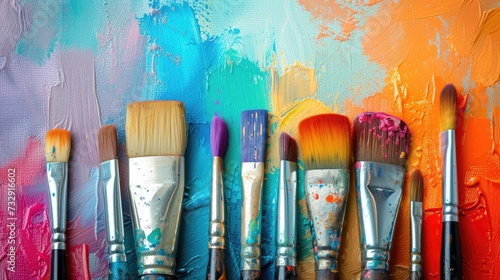 Row of vibrant paint brushes arranged on an abstract background, reflecting artistic creativity and inspiration, Ai Generated.