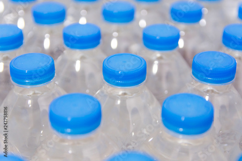 Row of water bottles. Bottles with blue caps For drinking water