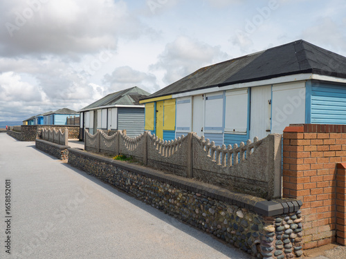 Row of wooden beach huts along the seafront in Fleetwood Lancashire