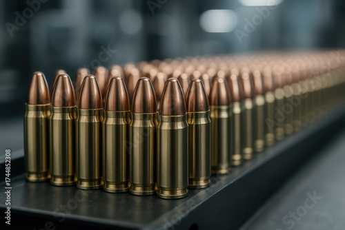 Rows of Brass Pistol Cartridges on Industrial Conveyor