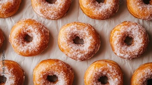 Rows of donuts covered with sugar, neatly laid out on parchment paper, highlighting a classic and delicious bakery setting, perfect for breakfast or a snack.
