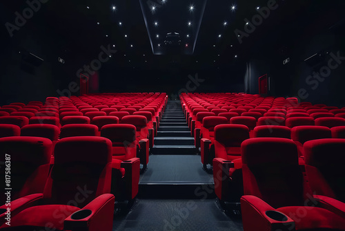 Rows of empty Red seats in cinema auditorium, waiting for the next movie show to begin